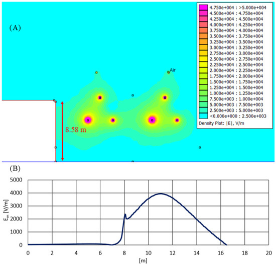 Results of numerical simulations for the distribution of the electric field intensity E: (A) wire distribution profile, (B) electric field level on the roof and side wall of the warehouse according to the profile marked in red in Figure 5A). The local maximum for the abscissa of 8 m results from the field concentration at the assumed radius of rounding the roof edge of r = 0.2 m.