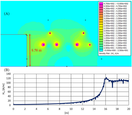 Results of numerical simulations for the distribution of the magnetic field intensity H: (A) Magnetic field distribution in the warehouse environment. Coordinates of suspension of cables of span 51–52 in the vicinity of the warehouse (phase cables L1–L3, lightning rod—LR). The walls and roof of the warehouse are made of 3 mm thick steel. The height of 2.0 m above the ground is marked with a red line. (B) The level of the magnetic field at a height of 2.0 m above the ground in accordance with the profile given in Figure 6A) (red line) calculated for catastrophic conditions assuming the height of the lowest cables above the ground of 5.8 m. The hall walls are made of structural steel. The maximum value of the field intensity occurs at the warehouse wall.