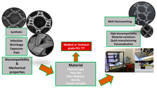 Lastly, medical-grade PCL has been used to print scaffolds for tissue regeneration through melt electrowriting (MEW). This approach has enabled the production of meticulously crafted box-shaped scaffolds with exceptional precision and clarity while avoiding toxic organic solvents and aligning with safety and regulatory requirements for clinical implementation [33]. The innovative MEW technique not only offers a promising avenue for creating well-defined scaffolds but also underscores its compatibility with future medical practices, paving the way for advancements in tissue engineering and regenerative medicine.