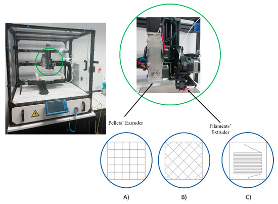 MEW prototype with pellet and filament extruders. Square-shaped mesh (A); diagonal-shaped mesh (B); dynamic calibration setup illustration (C).