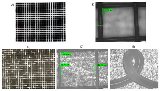Optical images of meshes produced with optimal parameters are shown in panels (A,B), while panels (C–E) display meshes with inadequate printing parameters, which exhibit imperfections.