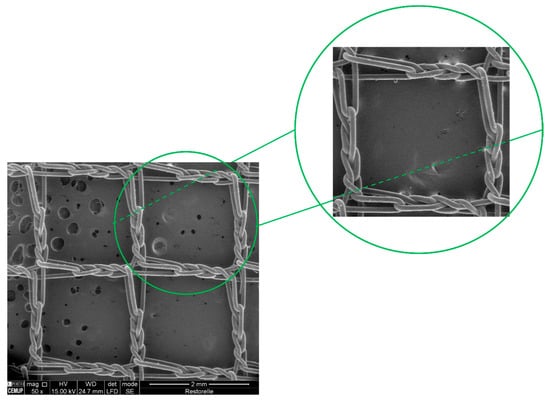 The medical-grade meshes produced were compared with a commercially available synthetic mesh, Restorelle® (Figure 5). This mesh is constructed from polypropylene knitted monofilaments with a density of 19 g/m2. It features pores approximately 2 mm in diameter and is composed of three filaments, each with a diameter of 80 µm (see Figure 5) [35,36,37].