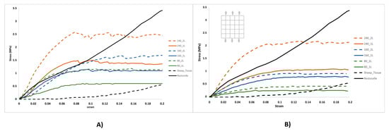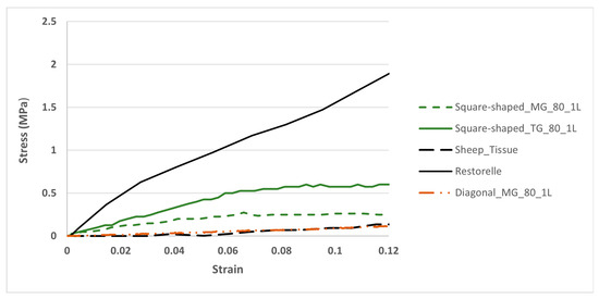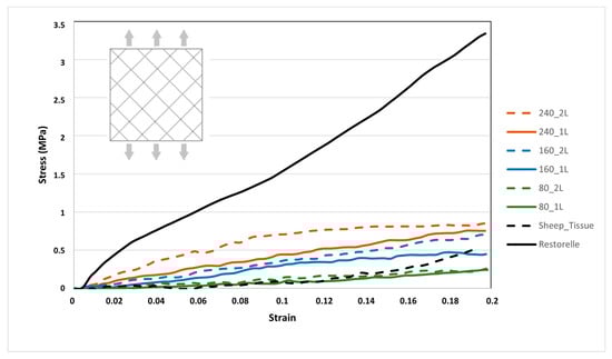 Figure 6 illustrates the mechanical response of uniaxial stress–strain behavior for square-shaped mesh geometries printed with non-medical- (Figure 6A) and medical-grade PCL (Figure 6B). It also compares these responses with the mechanical behavior of vaginal tissue from a healthy sheep [38] and the polypropylene Restorelle® mesh (Figure 5) [14,19,20].