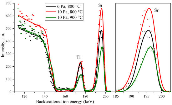 When studying the mechanisms of nucleation of strontium titanate films on silicon carbide substrates, the analysis of the energy spectra of backscattered ions from STO island films makes it possible to determine the geometric dimensions of the islands, the spread of their heights, and the degree of filling of the substrate with islands [54]. Figure 1 shows the spectra of helium ions after their interaction with island films deposited at different working gas pressures and substrate temperatures. It can be seen from the graph that the spectra of films deposited at pressures of 6 and 10 Pa are similar to each other, which indicates similar mechanisms of film formation in this pressure range. The peaks corresponding to ion scattering on the heavy elements of the film have an asymmetric triangular shape with an overextended low-energy front. A comparison of the model and experimental spectra obtained from films deposited at pressures of between 6 and 10 Pa allows us to conclude that the height of the islands is 3–4 nm and the degree of filling of the substrate with islands is 75% at the same amount of substance on the surface of the substrate. The shape of the spectra indicates an island height spread of about 50%, which corresponds to the film growth mechanism of Volmer–Weber.