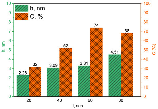 Figure 2 shows the dependence of the height of the islands and the degree of filling of the substrate with islands on the deposition time of the films. The dynamics of changes in the thickness of the film and the area of the substrate occupied by the islands allow us to conclude that under these conditions, at deposition times from 20 to 50 s, the stage of the formation of islands as a result of the fusion of small nuclei, the so-called primary coalescence, is realized. At this stage, the main mass transfer is carried out by diffusion of the substance over the substrate in the spaces between the islands. After 50 c of deposition, the island formation stage is replaced by a secondary coalescence stage, when the fusion of the islands begins to form a single structure in the form of a grid. At this stage, the degree of coating of the substrate surface with a condensed substance increases sharply due to a change in the shape of the islands to a flatter one. This stage of film growth is characterized by significant mass transfer over the surface of the accreting island grains [52].