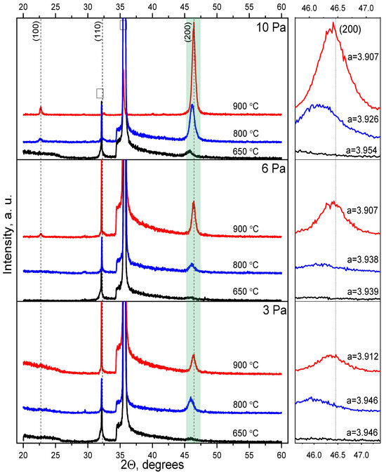 Figure 3 shows the diffraction patterns of STO films on silicon carbide deposited at different substrate temperatures and working gas pressures. The positions of reflections for bulk strontium titanate (PDF 35–734) are marked with vertical dotted lines, and the reflections of the substrate are marked with diamonds. The diffraction patterns for all the studied samples confirm the formation of pure strontium titanate with a perovskite structure. The films formed at a low substrate temperature are polycrystalline and strained—the diffraction patterns contain reflections (110) and (200), the position of which differs from the positions of reflections of an unstrained STO crystal. With an increase in the deposition temperature, the intensity of the reflection (200) increases and the angular positions of the peaks shift toward larger angles, which means a decrease in the unit cell parameter from 3.95 to 3.907 Å. These trends are typical for all the considered working gas pressures, and indicate a significant improvement in the crystal structure of STO films and a decrease in internal stresses in the lattice.