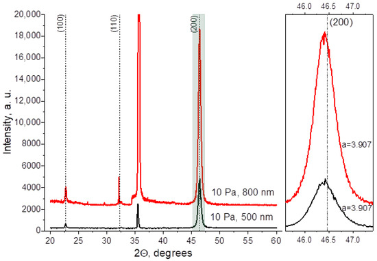 Let us compare the diffraction patterns of STO films deposited at Ts = 900 °C, but at different pressures. The films exhibit a single-phase predominantly oriented structure (h00) at the absence of internal stresses in the lattice. The high temperature of the substrate ensures the active surface diffusion of particles before their incorporation into the STO lattice, which leads to the formation of an unstressed defect-free film. In addition, the intensity of the (200) reflex of the film deposited at a pressure of 10 Pa is half an order of magnitude higher than the intensity of similar peaks of films formed at low pressures. Thus, the tendency to improve the structure is most pronounced for films deposited at elevated working gas pressure, which confirms the thesis of oriented crystallization at low supersaturation. Figure 4 shows comparative diffractograms of films of various thicknesses deposited under optimal conditions from the structure point of view (Ts = 900 °C, P = 10 Pa). With an increase in the thickness of the STO film, a significant improvement in its crystal structure is observed—the intensity of the (200) reflex increases significantly, and the peak width (FWHM ≅ 0.6°) decreases to values close to those for a single crystal (FWHM ≅ 0.3°). Trends in improving the structural quality of strontium titanate films with an increase in their thickness are noted in [55,56].
