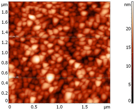 Figure 5 shows a typical image of the surface of an STO film on silicon carbide obtained using atomic force microscopy. The surface is a homogeneous granular structure without visual defects with grain sizes of about 100–150 nm and a surface roughness of 10–20 nm. The films under study have similar surface morphology, which is determined by the island growth mechanism in the considered technological regimes.