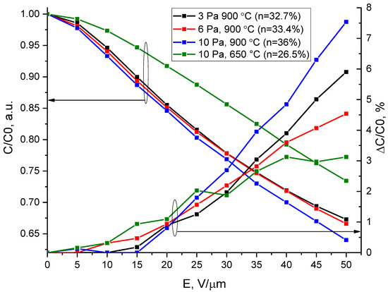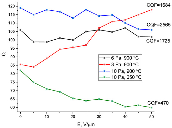 The electrical properties of STO films were studied on the samples that demonstrated the best structural characteristics. Figure 6 and Figure 7 show the normalized capacitance, response time parameter, and quality factors of planar capacitors formed on the base of STO films on silicon carbide, depending on the control field strength. For comparison, the figures also show the characteristics of the capacitors based on the STO film deposited at Ts = 650 °C and which had a significantly worse structure. The graphs show that the nonlinearity and microwave losses of the capacitors correlate with the structural quality of the films under study. Capacitors formed on the basis of films deposited at P = 10 Pa and having a minimum number of structural defects and internal stresses exhibit a tunability of 36% at a quality factor of 120–105, while capacitive structures on films deposited at 3 Pa—32.7% at a quality factor of 85–115. Noteworthy are the dynamics of decreasing capacitance with increasing control field strength and the absence of a flat section of the C-V characteristic at a field strength of more than 30 V/µm. This indicates that the tunability of the studied capacitors is far from saturation and that the nonlinearity of the structures can be increased by increasing the level of control action. The best combination of tunability and losses of capacitive elements can be determined based on the commutation quality factor CQF. According to [1], for effective use in microwaves, a capacitive element should demonstrate a CQF of at least 1000. Table 1 shows the comparative electrical characteristics of the studied capacitors—capacitance, quality factor, tunability, and the CQF calculated on their basis. A CQF value of more than 2500 allows us to expect the promising characteristics of controlled microwave elements based on STO/SiC films.