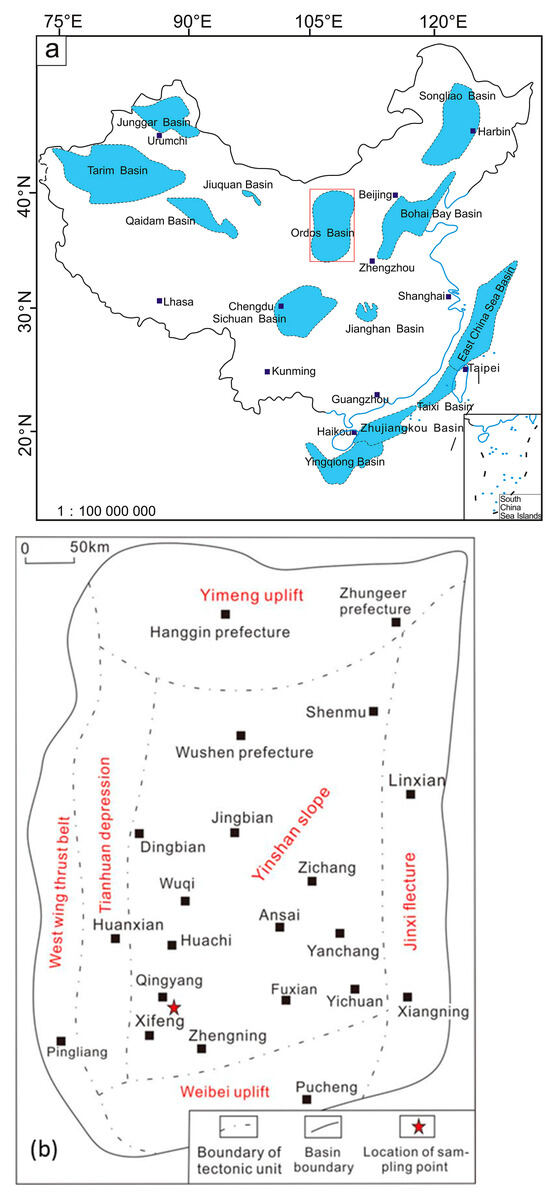(a) Geographical location of the Ordos Basin Region. (b) Geographical location of the Xi 233 well site (the sampling point is located at the Xi 233 well site). (c) Stratigraphic unit of Yanchang Formation in the Xi 233 well area (C7 stands for Chang 7 member of Yanchang Formation, and other formation codes follow this convention) [25].