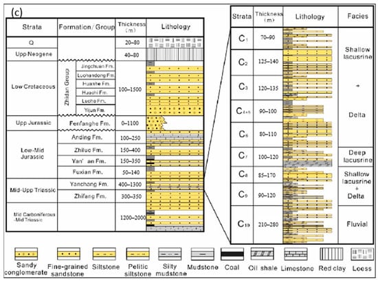As a cratonic basin, the Ordos Basin exhibits stable subsidence and relatively undisturbed strata [6,7,12]. However, due to subsequent tectonic activity, some areas exhibit missing strata. The thickness of the Yanchang Formation is generally greater than 1000 m but less than 1500 m [26]. The Yanchang Formation is divided into ten sections from bottom to top (Figure 1b). This study focuses on the seven sections that primarily feature sedimentation ranging from semi-deep lake to deep lake facies.
