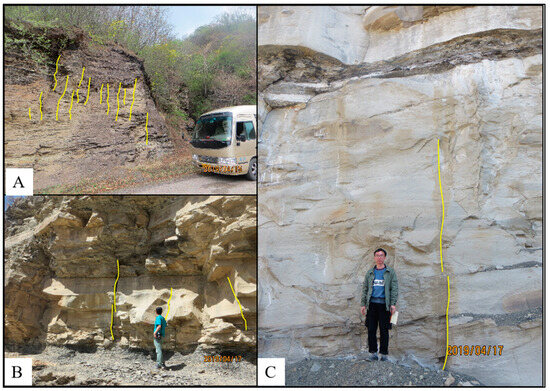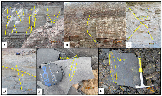 Detailed analysis of fracture development characteristics in field outcrops. (A) A network system composed of multiple high-angle shear fractures; (B) a single shear fracture extending over considerable distances; (C,D) the angles of the conjugate shear fractures are 62° and 54°, respectively; (E) the fracture-filling material is calcite; (F) the filling material within the fracture network system is pyrite.