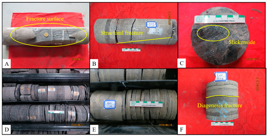 Figure 3. Fracture development characteristics in rock cores. (A,B) High-angle structural fractures; (C) slickenside; (D,E) horizontal bedding fractures; (F) diagenetic fractures caused by lithological interface changes. - (2)