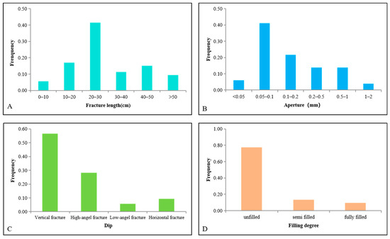 Histogram representing fracture development in rock cores. (A) Characteristics of fracture length. (B) Features of fracture aperture. (C) Aspects of fracture dip. (D) Details of fracture filling degree.