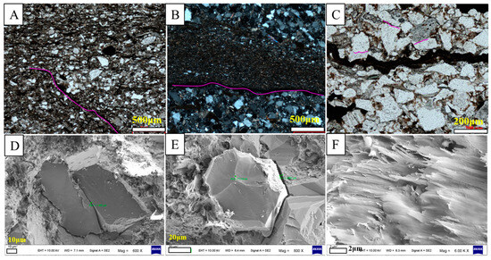 Microscopic fracture identification focuses on fractures with apertures less than 0.1 mm, observable through thin sections and scanning electron microscopy [23,40]. Observations of rock thin sections and scanning electron microscopy reveal a significant number of microfractures in the Chang 7 member of the Yanchang Formation, predominantly intragranular, intergranular, and transgranular fractures (Figure 5A–F). Despite their small size, these fractures play a critical role in subsequent dissolution processes. Intragranular and intergranular fractures can develop secondary pores through dissolution processes [40,55]. Additionally, these fractures contain minimal filling material, making them effective storage spaces and significantly enhancing the physical properties of tight sandstone reservoirs [56].