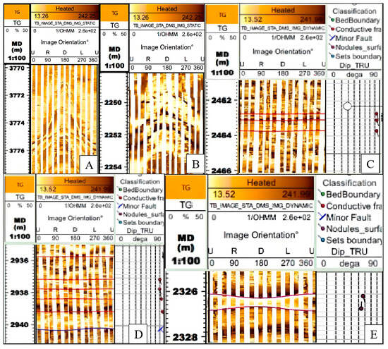 Characterization of various fractures using imaging logging. (A) High-resistance fractures; (B) high-conductivity fractures; (C) induced fractures; (D) small fault; (E) nodules.