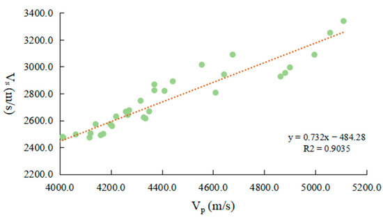 To obtain rock mechanics parameters, the shear wave travel time must first be determined [57,58]. However, measuring shear wave travel time is both costly and complex, resulting in the widespread practice of measuring only longitudinal wave travel time [37]. The longitudinal and shear wave velocities were determined in this study. Therefore, a conversion relationship between shear wave (vp) and longitudinal wave (vs) velocities was established (Figure 8), thereby forming a regional empirical conversion formula: