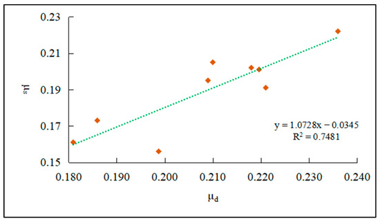 The range of the static Poisson’s ratio is 0.14–0.24, while the dynamic Poisson’s ratio ranges from 0.17 to 0.25. The differences between the two ranges are not significant, with the dynamic Poisson’s ratio generally exceeding the static Poisson’s ratio. Fitting analysis of static and dynamic Poisson’s ratios yields a correlation coefficient of 0.7481, indicating a strong positive correlation between them (Figure 10). The conversion relationship between dynamic and static Poisson’s ratios is: