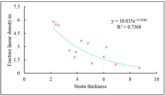 There is a correlation between stratum thickness and fracture development. Analysis of the thickness and fracture linear density in tight sandstone from field profiles in the Chang 7 member reveals a negative correlation between fracture linear density and rock layer thickness (Figure 11). Specifically, an exponential relationship is observed between the exposed fracture linear density and rock layer thickness (Figure 12). As rock layer thickness increases, the linear density of fracture decreases. Conversely, a reduction in rock layer thickness corresponds to an increase in fracture linear density. Notably, when the layer thickness exceeds 5.2 m, the change in fracture linear density becomes gradual (Figure 12). However, when the thickness falls below 2.5 m, there is a pronounced variation in fracture linear density.