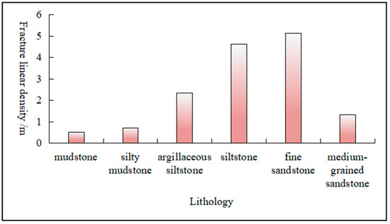 The development of fractures in sedimentary rocks is intricately linked to the inherent properties of the rocks, with variations in lithology resulting in differing mechanical properties. Under external stress, the degree and mode of deformation vary accordingly. Typically, plastic rocks are less prone to fracturing. In the study area, the predominant lithologies include mudstone, silty mudstone, argillaceous sandstone, siltstone, fine sandstone, and medium-grained sandstone, with sandstone and conglomerate being relatively rare. Fractures are most prevalent in siltstone and fine sandstone, followed by mudstone and medium-grained sandstone, with the least development observed in mudstone and silty mudstone (Figure 13). In siltstone and fine sandstone, fracture line density can reach up to 5.2 per meter, whereas in mudstone, it is only 0.4 per meter (Figure 14). This variation is attributed to the fact that in brittle formations (i.e., siltstone and fine sandstone), stress is often released through fracturing, whereas in softer formations, stress is absorbed, reducing the likelihood of fracture formation.