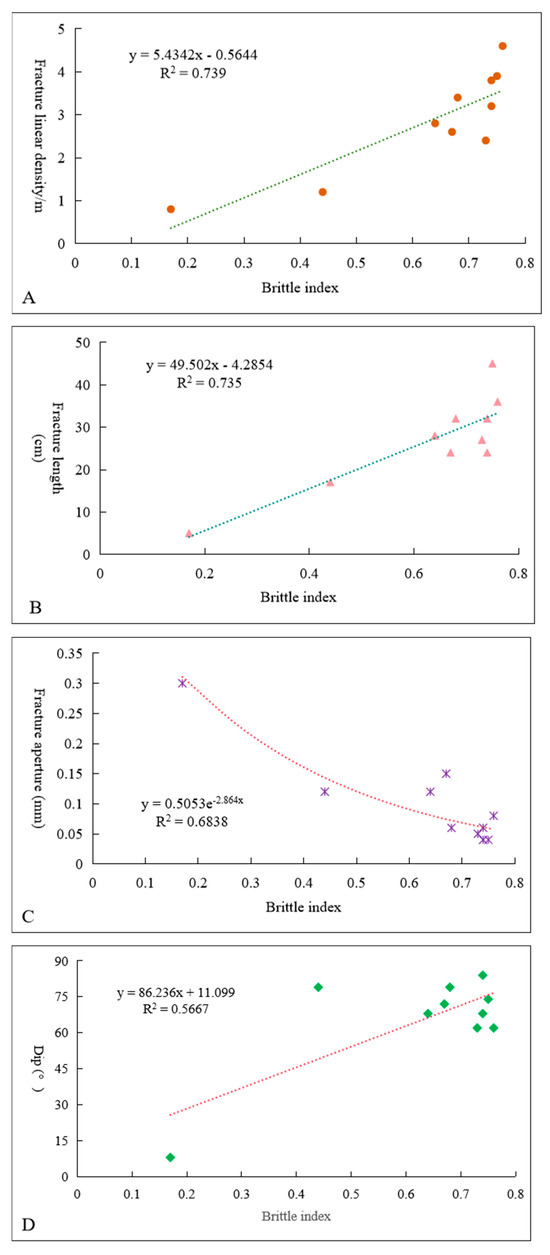 Correlation between fracture parameters and brittleness index. (A) The relationship between fracture linear density and brittleness index. (B) The association between fracture length and the brittleness index. (C) The connection between fracture aperture and the brittleness index. (D) The correlation between fracture dip and brittleness index.