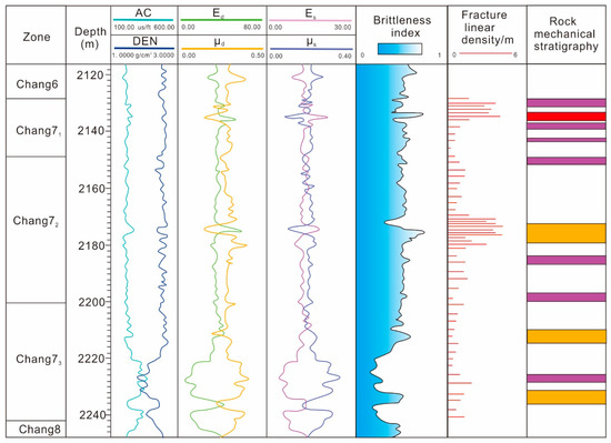 The rock mechanics layer is defined as a continuous rock unit with homogeneous mechanical properties, bounded by distinct upper and lower limits. The most apparent differences between rock mechanics layers are manifested in parameters such as fracture density, spacing, and occurrence [36]. Currently, rock mechanics layers can be categorized using methods such as deformation, petrological, sequence stratigraphy, and rock mechanics parameter approaches. This study employs the rock mechanics parameter method to delineate rock mechanics layers, utilizing the brittleness index as the primary indicator [36,50,51]. Based on the definition of rock mechanics layers and analogous well logging interpretations, the midpoint of the brittleness index is used as a reference. When adjacent marker points exhibit similar mechanical parameters, they are grouped into the same rock mechanics layer.