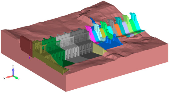 Figure 3). The model was based on the dam’s three-dimensional geometric model, the engineering–geological structure of the surrounding terrain, and the exploitation conditions of the terrain, which was divided into eight geological areas. The dimensions of the model are 400 × 442 × 50 m. Upstream and downstream ranges are both 200 m. The FEM model includes the spillway (on the right in