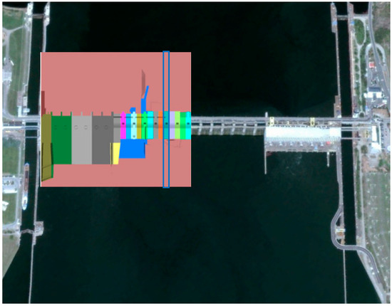 The same finite element model was used for thermal analysis, fluid flow analysis through a porous medium, and stress–strain analysis. The spillway of the dam is divided into sections, known as lamellas. Lamela 10 is marked with the blue box in
