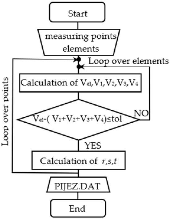 Figure 6 areas follows: input parameters are 3D elements and nodes of 2D cross section; output is an ASCI file that contains the ID of the 2D node, the ID of the 3D element in which the node is located, the coordinates of the 2D element, and the local coordinates. Equation (8) is used to calculate the potential/temperature values in the nodes of the 2D cross section.