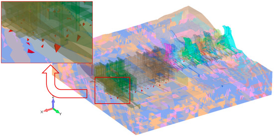 Figure 7 shows the model with marked elements that contain measuring points that monitor the groundwater level. The API also creates an ASCII file called PIJEZ.DAT that includes the designation of the measuring point, the ID of the element, the global coordinates (x, y, z) of the measuring point, and the local coordinates (r, s, t) of the measuring point within the element. A portion of the PIJEZ.DAT file is shown in
