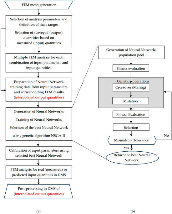 Once trained, the neural network is used for calibrating model parameters instead of the FE model. For known observed quantities (temperature, potential, etc.), populations are created with individuals that contain the values of the parameters to be calibrated. The evaluation of individuals is performed by calculations on the neural network, rather than the FE model. The goal is to minimize the difference between the calculated and observed values defined through the calibration criterion. When the convergence criterion is met, the best individual contains the calibrated values of the FEM model parameters.