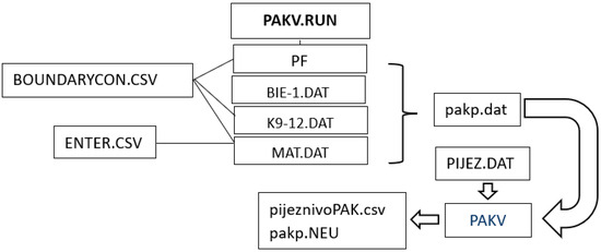Figure 9). The input file, pakp.dat, for the PAKV program contains all of the finite element data about the model (nodes, elements, material characteristics, boundary conditions, etc.) and an identifier indicating whether or not to read the measurement points, the locations of which were saved in the file PIJEZ.DAT.