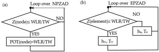 Figure 11. During the execution of the PAKV program, a check is performed if the z coordinate of the nodes on which the “possible” potential is prescribed is lower than the set water level in the reservoir and tailwater, i.e., whether the node is wetted. If the node is wetted, the potential is set to be equal to the water level in the reservoir or the tailwater, else it is not prescribed; see