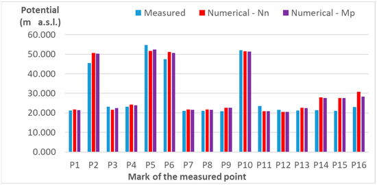 A comparison of the measured and calculated values for the calibrated set of filtration parameters is presented. The numerically calculated potential values (Mp) at the measuring points are compared with the measured potential values and numerical values of the nearest neighbor node (Nn) (