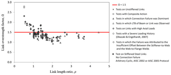 Several researchers have conducted studies to determine the Ω factor of links. Okazaki and Engelhardt [3] and Okazaki et al. [4] conducted experimental studies using ASTM A992 wide flange sections (W-sections), obtaining Ω factors of up to 1.4. They found that Ω factor decreased as the link became slenderer. Azad and Topkaya [2] collected Ω factors of W-section links from previous experimental studies, as shown in Figure 1. As shown in the figure, the Ω factor of short links ( was greater than 1.5, while that of intermediate links () appears to be less than 1.5. For long links, Ω = 1.5 can be considered a reasonable upper bound.