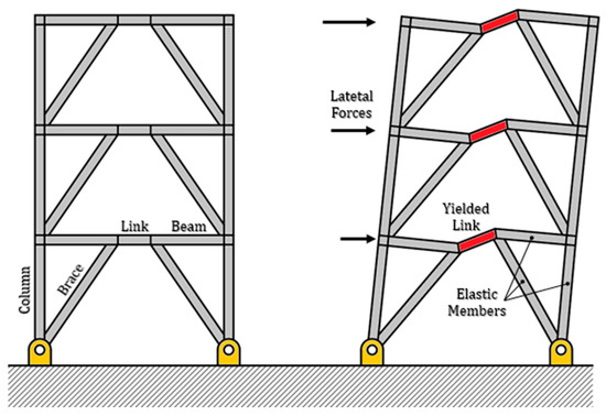 - Rozon, J.; Kovoebic, S.; Tremblay, R. Study of global behavior of eccentrically braced frames in response to seismic loads. In Proceedings of the 14th World Conference on Earthquake Engineering, Beijing, China, 12–17 October 2008. [Google Scholar]