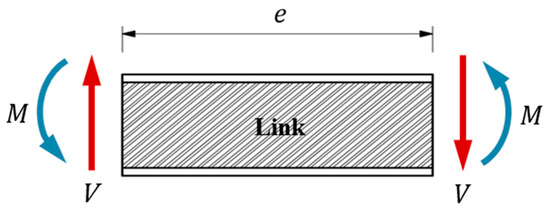 The yielding behavior and deformation capacity of a link depend on its length. Shorter links tend to be governed by shear yielding, while longer links tend to be governed by flexural yielding. Thus, shorter links provide greater strength and a larger inelastic deformation capacity, whereas long links have the advantage of being able to freely place openings. In a K-braced frame, when the link is placed at the center of the bay, the moments at both ends of the link are identical. The relationship between shear force (), end moment (), and link length () can be represented by a simple equilibrium equation (see Figure 3), as follows:
