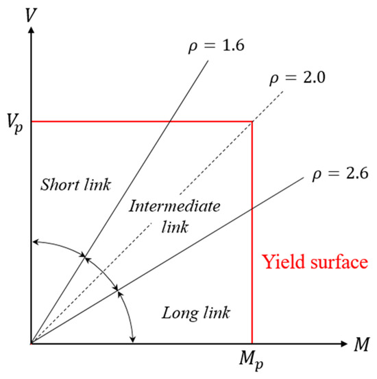 Most design codes, including AISC 341 [1], SEAOC [13], and Eurocode 8 [14], classify links into three categories: “Short links” have a length ratio (ρ), as defined in Equation (3), of 1.6 or less; “long links” have a length ratio of 2.6 or more, as shown in Figure 4; and links in between are classified as “intermediate links”, where the interaction between shear and moment is expected in the plastic range. In short links, energy dissipation occurs mainly through the inelastic shear behavior of the link web. However, in long links, energy is dissipated mainly via plastic hinge formation at both ends of the link flanges.