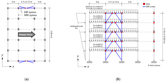 Figure 8 shows the plan and elevation views of the example building. The example building has a plan consisting of 3 × 5 modules, with each unit having a square shape of 6 m × 6 m. All stories are 4 m in height. The K-braced EBF is located at the center of the exterior frame along the x-axis in all stories, as shown in Figure 8a. The beams, braces, and columns in the EBF are rigidly connected to one another. To ensure that the seismic load is resisted by the EBF only, the beams in the spans on either side of the EBF were hinge-connected to the columns. The effective seismic weight corresponding to 1.0DL + 0.25LL was considered in the analysis model. The red squares in Figure 8b represent the nodes where mass was assigned. In the y-axis direction, a moment-resisting frame was employed as the lateral-force-resisting system, which is not considered in this study.