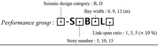 Various design conditions were considered, including the seismic design categories, height, width, and link length of the frames. Two site conditions of site classes A (hard rock) and D (stiff soil) were considered, resulting in two seismic design categories (SDCs), B and D, respectively. Furthermore, three building heights (5, 10, and 15 stories), three bay widths (6, 9, and 12 m), and three link span ratios (10%, 30%, and 50%) were considered. The variations in the design conditions are summarized into 54 performance groups and identified using the notation shown in Figure 9.