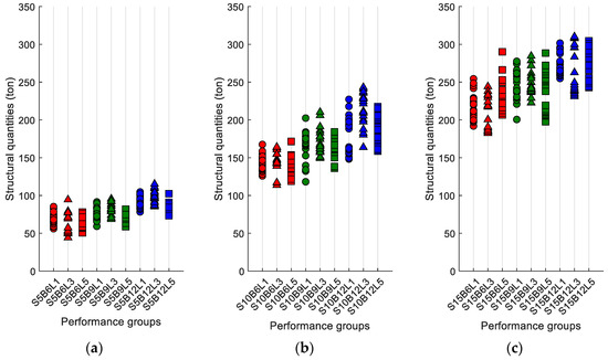 Structural quantities by performance group: (a) five-story building; (b) ten-story building; (c) fifteen-story building.