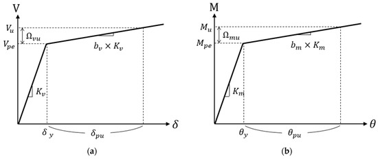 The expected yield strengths of the TS and RS elements, and in Figure 14, respectively, were calculated using Equation (4b,c), respectively. In the case of short links, which are governed by shear yielding, the TS element attains its ultimate strength, including strain-hardening behavior, while the RS element remains elastic. In the case of long links, the TSs and RSs behave in a manner opposite to that observed in short links. The ultimate plastic rotations for the TSs and RSs were set as 0.08 and 0.02 rad, respectively. These values are identical to the allowable plastic rotation angles for short and long links, as specified in AISC 341 [1] (Figure 6).