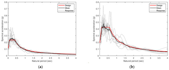 Spectral accelerations of the selected earthquakes: (a) SDC B; (b) SDC D.