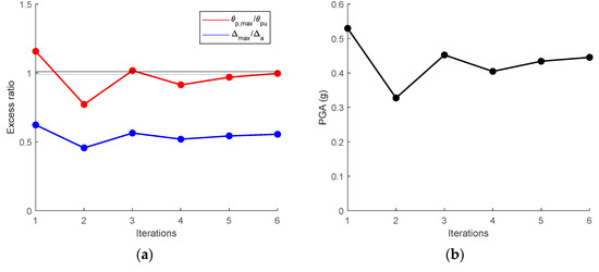 Figure 16 illustrates the progress of iterations in the dynamic analysis using the line search method in the case of B-S15B9L1 as an example. An initial guess of 0.5 g was chosen for the maximum PGA (peak ground acceleration). After the first iteration, the PGA for the second iteration was determined based on the maximum link plastic rotation or the story drift recorded in the first iteration. As shown in Figure 16, the link plastic rotation was the dominant parameter rather than the inter-story drift, and the structure reached its limit state after six iterations.