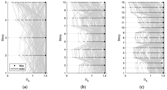 Figure 17 shows the link overstrength demand for the design of beams outside link and braces for the five-, ten-, and fifteen-story buildings. Each light-gray line depicts the overstrength demand in a single time history response; therefore, the value varies across stories. However, the maximum values in all time history responses (dark dots in Figure 17) reached 1.5 in all stories, which was expected, as the analytical link models (Figure 13) were established such that the maximum link strength was 1.5 times its yield strength. Therefore, a value of 1.5, which is equivalent to Ω factor of 1.25 in AISC 341 [1] for the design of beams outside link and braces, is reasonable.