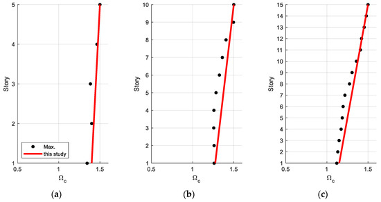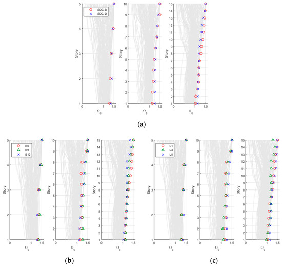 factor from nonlinear dynamic analysis results: (a) five-story building; (b) ten-story building; (c) fifteen-story building.