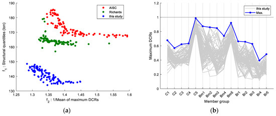 Performance of the EBFs designed using the proposed equation (D-S15B9L1): (a) objective space of the design examples; (b) maximum DCRs of the member groups.