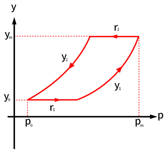 Considering that the quadratic function and the hysteresis curve of the pneumatic artificial muscle have similar shapes, and given its basic properties of being invertible, bounded, and continuous, a quadratic function is adopted as the envelope function for the UPI model in this study. This model is named the QUPI model. By integrating this function with the UPI operator, the descending and ascending edges of complex hysteresis phenomena can be obtained. The schematic diagram of the QUPI operator is shown in Figure 1 (the horizontal axis represents the pneumatic muscle pressure p, and the vertical axis represents the pneumatic muscle displacement y). The envelope function of the basic operator in the QUPI model consists of two quadratic parabolas, with the axis of symmetry aligned with the starting points of the ascending and descending branches of the hysteresis curve, making it more consistent with hysteresis characteristics. Based on the analytical expression of a quadratic function, the analytical expressions for a single QUPI operator can be derived when the pressure increases and decreases, as shown in Equations (2) and (3). Subsequently, the final QUPI model is formed by stacking Na × Nb small QUPI operators, and the structure of the QUPI model is shown in Figure 2. The computational formula of the QUPI model is given in Equation (4).