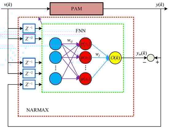 In the equation, represents the output of the NARMAX model, f(t) and represent the output of the QUPI model at time t, and represents the PAM load. na, nb, and nc are the maximum delay times of , f(t) and m(t), respectively. Accordingly, the input vector of the dynamic submodel contains the present and historical values of the output and load of the hysteresis submodel, as well as the historical output displacement values, which can capture the dynamic information of the driving frequency and load.