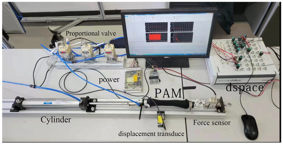 The experimental object is the McKibben-type PAM made in the laboratory. To illuminate the hysteresis relationship between displacement and pressure, an experimental device, as shown in Figure 4, was constructed. The cylinder (SC standard cylinder 32 × 250) acts as a load to reduce accidental errors caused by hanging heavy objects or weights. During the experiment, the pneumatic muscles are placed horizontally, with one end fixed by a force sensor (MEACON MIK-LCSI) to the experimental platform and the other end linked with a cylinder by installing one laser displacement sensor (Panasonic HG-C1100) baffle. The internal pressure of the pneumatic muscles and cylinder pressure are controlled by a proportional valve (NITV 2050-312L). As shown in Figure 5, the computer host communicates with dSPACE and sends an analog signal to the proportion valve. Then, such a valve converts voltage signals into pressure signals. In addition, this charges and deflates the cylinders and PAMs that rely on the air pressure provided by the air compressor at the air source. In addition to the tension-compression sensor, the laser displacement sensor converts the tension and displacement changes of the PAM into voltage signals and outputs them to dSPACE to return to the computer host. Next, the output signals mentioned are changed into tension and displacement by the Simulink program. The main data recorded are the input voltage of the pneumatic muscle, the cylinder input voltage, the tension-compression sensor output force, and the laser displacement sensor output displacement. This paper mainly studies the hysteresis pertinence between pressure and displacement, with the readings of the force sensor not used.